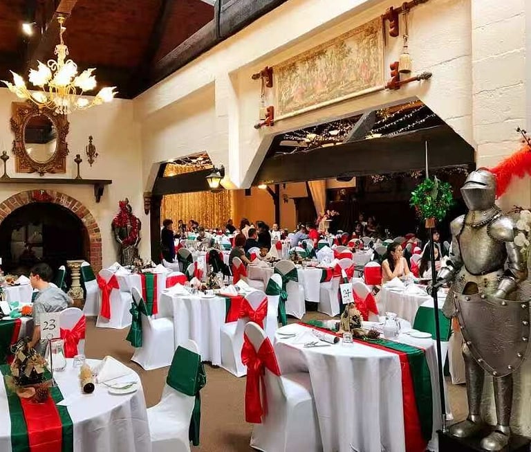 Guests can enjoy the inviting ambience of the Banquet Hall, centred around a grand indoor fireplace that brings warmth and atmosphere to winter celebrations - a memorable focal point for seasonal décor or even a special Santa appearance. The manor’s versatile spaces comfortably accommodate both relaxed social functions and more formal festive occasions.