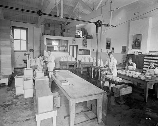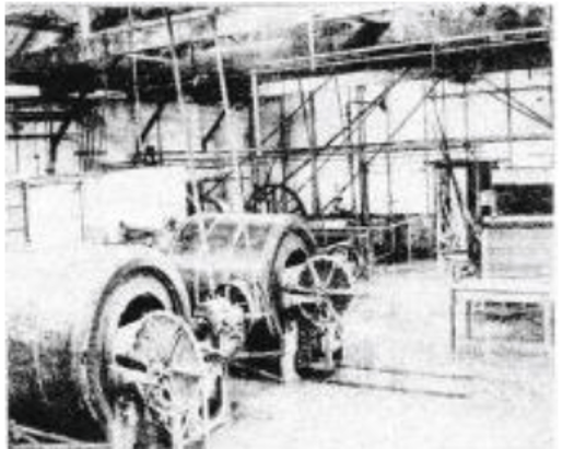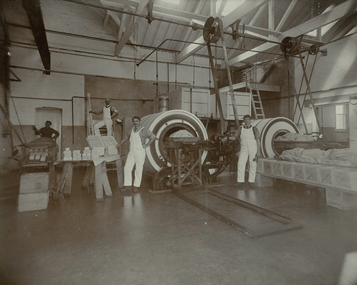 In its early days it was steam driven. Powering the pumps and churns through a setup of belts and shafts. Large amount of coal were supplied by rail adjacent to the factory. Approximately ten years later it was converted to electricity.