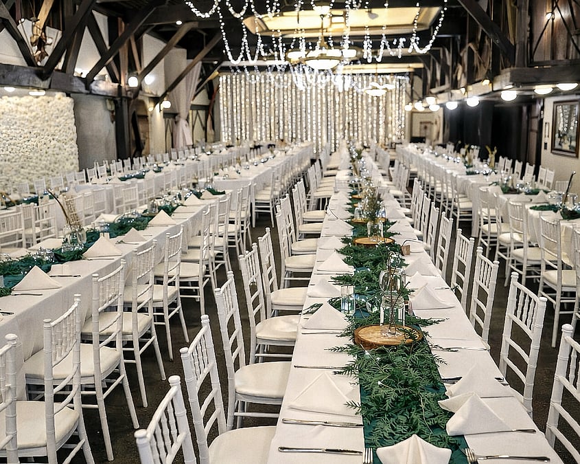 The hall may be arranged with round tables or elegant long banquet tables, allowing flexibility in event design and layout. A grand indoor fireplace enhances the atmosphere, creating a warm and inviting setting ideal for evening functions.