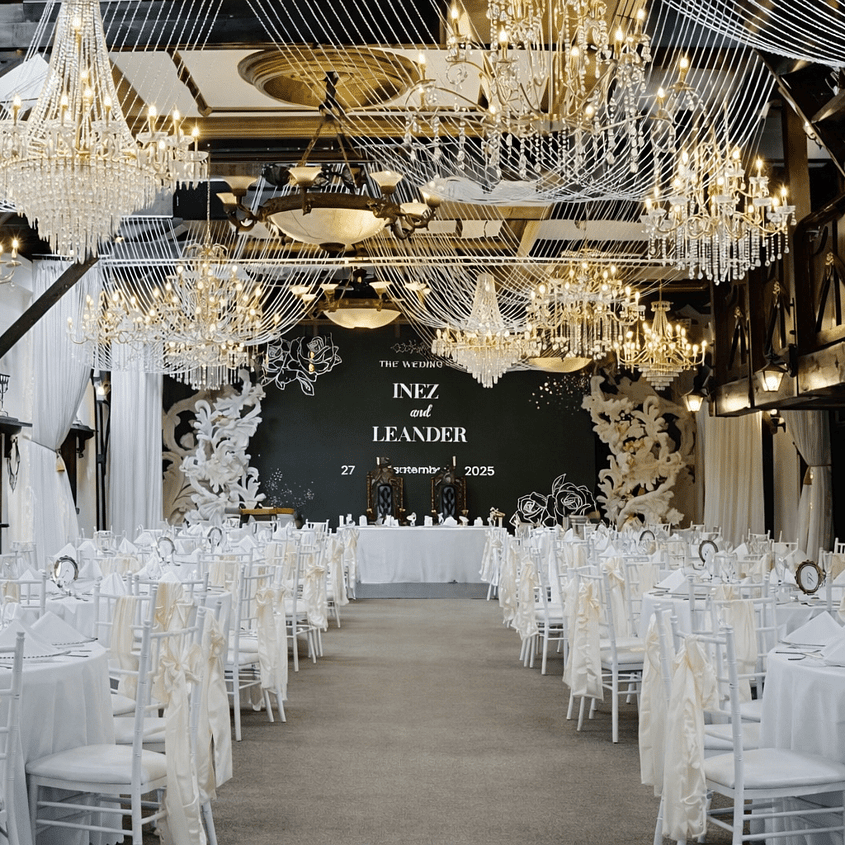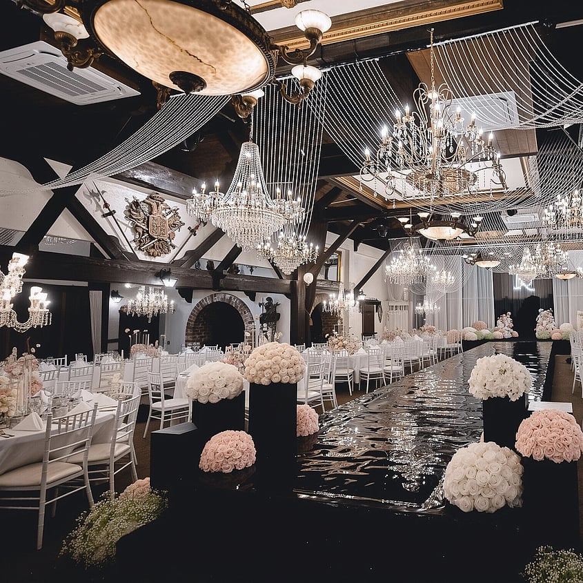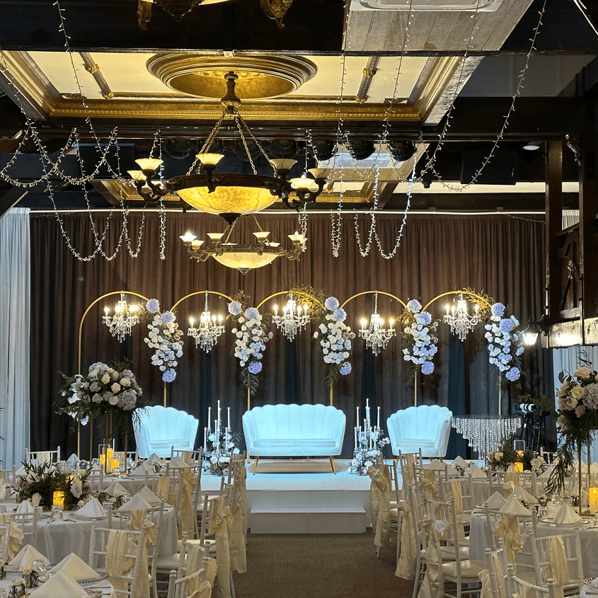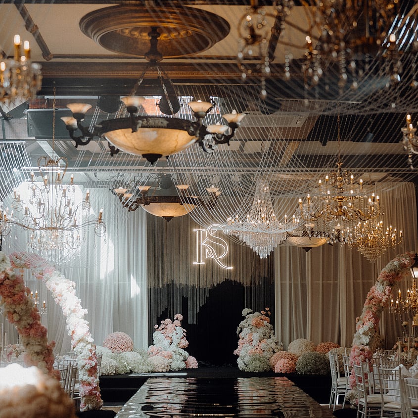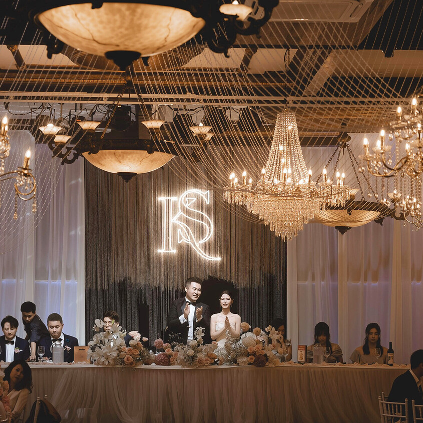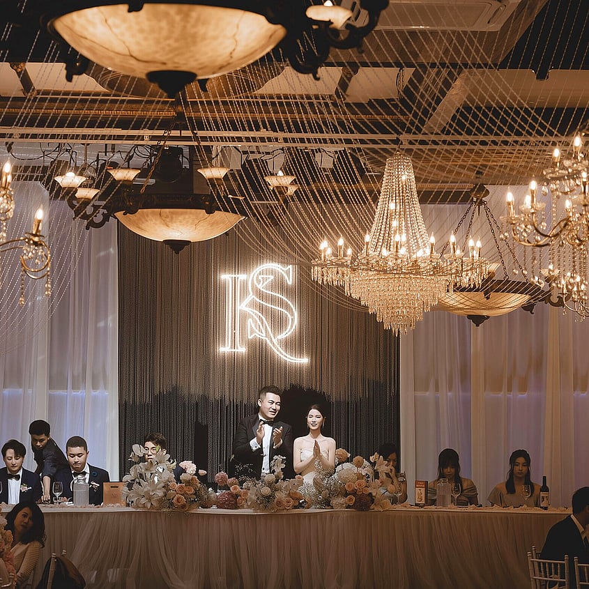 Browse how couples have configured the room for their celebration, from guest seating layouts and head table positioning to floral styling, place settings, and ambient lighting across the evening.